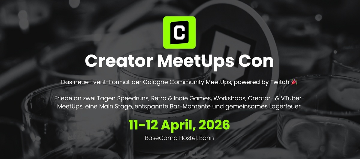 Creator MeetUps Con – das neue Event-Format der Cologne Community MeetUps, powered by Twitch, bringt am 11. und 12. April 2026 Creators, Gamer:innen und Communities im BaseCamp Hostel Bonn zusammen. An zwei Tagen erwarten die Besucher:innen Speedruns, Retro- und Indie-Games, Workshops, Creator- und VTuber-MeetUps sowie eine Main Stage und entspannte Community-Momente.