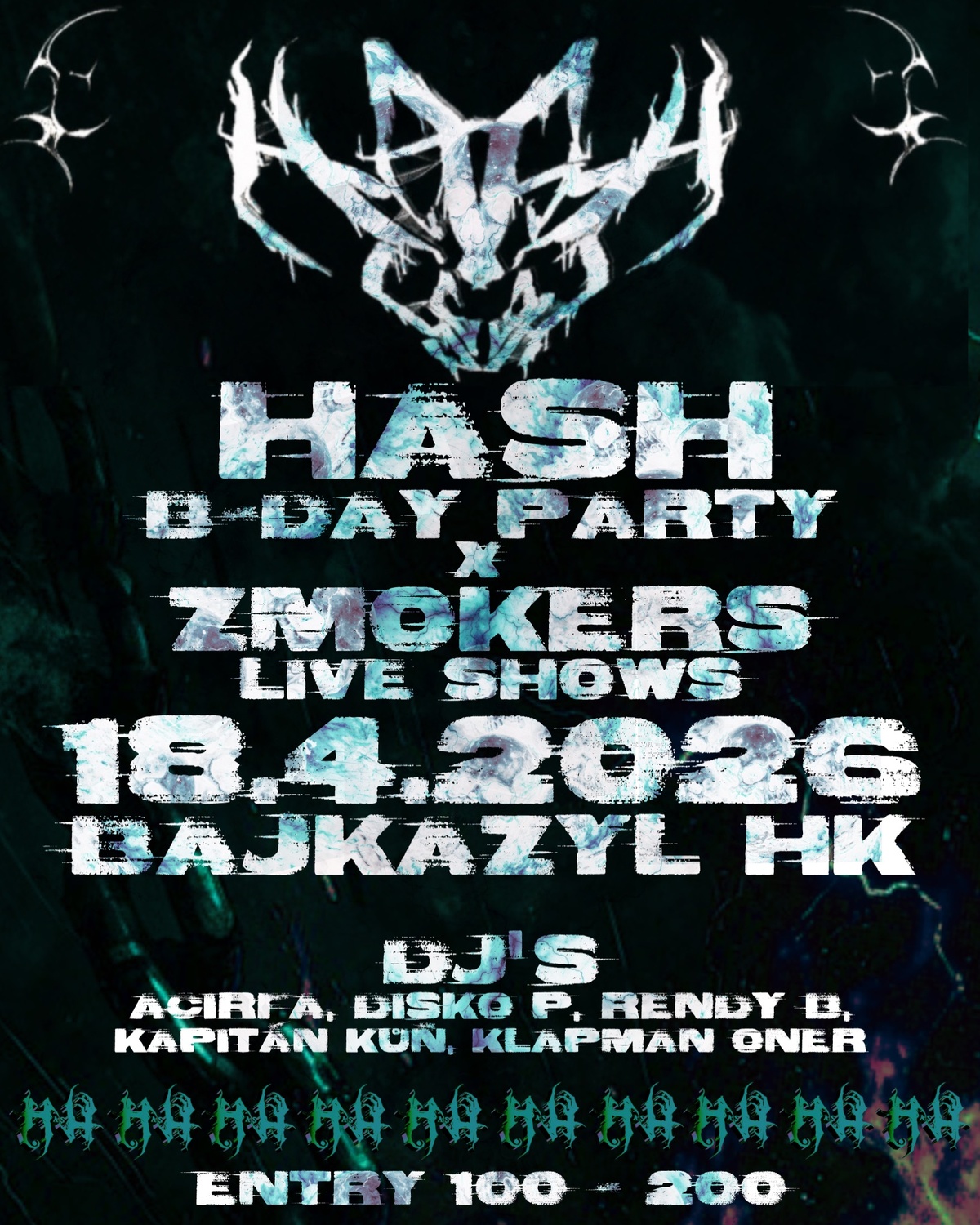 HASH CREW Slaví 5 let od založení 🥳🧨!! A připravili jsme si pro vás pořádnou nálož - HASH & ZMOKERS LIVE SHOWS. A DJ’s ACIRFA, DISKO P, RENDY B, KLAPMAN ONER & KAPITÁN KŮŇ. ⛓️💥🔥🔥🪖 Přijd' si užít pořádnej randál v BAJKAZYL HK